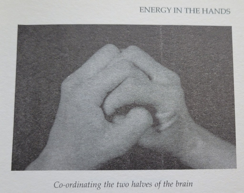I had previously experimented with hand positions after reading Jan de Vries’ “Body Energy” and found that certain gestures had a quick and distinct impact on my energy level as well as on my mental and emotional state. I still particularly enjoy the following one, internally interlacing all fingers and thumbs, that helps coordinate the two halves of the brain:
